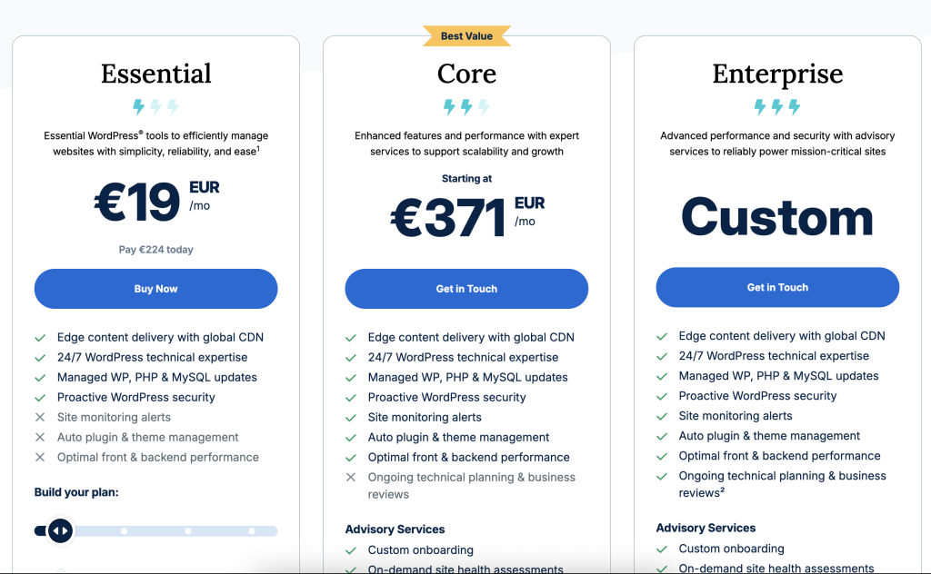 Ces plans sont particulièrement adaptés à ceux qui ne nécessitent pas de fonctionnalités avancées mais souhaitent tout de même bénéficier de la qualité et de la sécurité offertes par un hébergeur premium comme WP Engine. Avec une attention particulière portée à la simplicité et à l’efficacité, ces plans permettent aux utilisateurs de se concentrer sur la création de contenu et la croissance de leur présence en ligne sans se soucier des aspects techniques de l’hébergement.